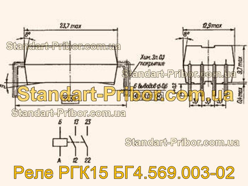 Реле РГК15 БГ4.569.003-02 электромагнитное слаботочное герконовое низкочастотное двухпозиционное одностабильное управляемое постоянным током с двумя замыкающими контактами.